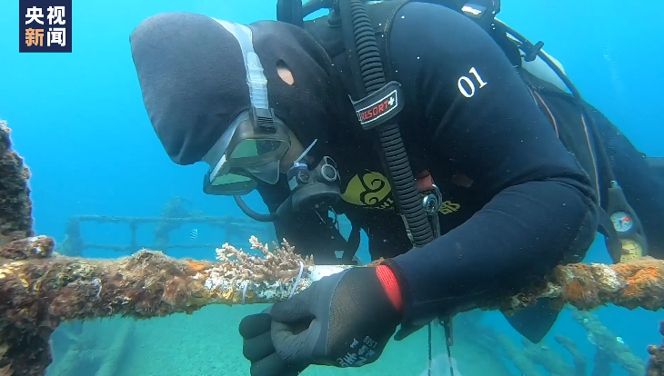 总台央视记者 宋菀:来到海南不去潜水怎么行?说到潜水,大家首先想到的是去海底看美丽的热带鱼,而在蜈支洲岛,您还可以体验珊瑚种植,通过认领的方式,将属于自己的“珊瑚宝宝”种植在海底。