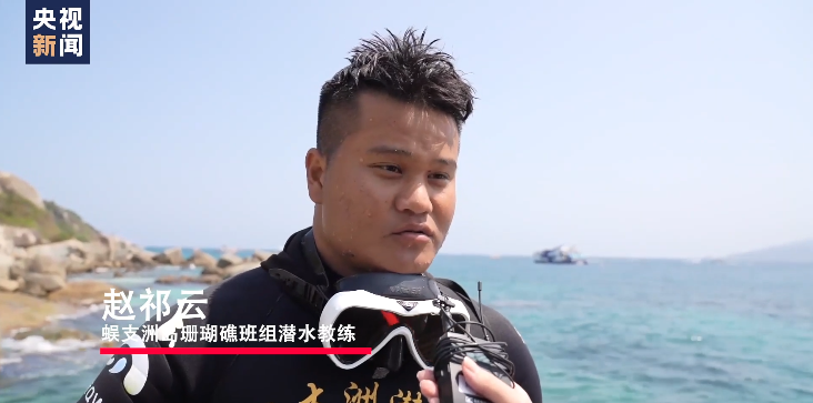 蜈支洲岛珊瑚礁班组潜水教练 赵祁云:我们会有专门的人下海巡查,发现停止生长的,或者有些脱落的珊瑚宝宝就会对它进行替换。