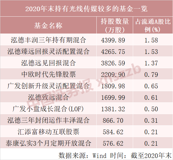 除邬传雁外,周应波和刘格菘管理的基金也持有较多光线传媒股份。其中,截至2020年末,由周应波管理的中欧时代先锋股票持有2209.90万股;由刘格菘管理的广发创新升级和广发小盘成长A分别持有1809.98万股和1381.32万股。