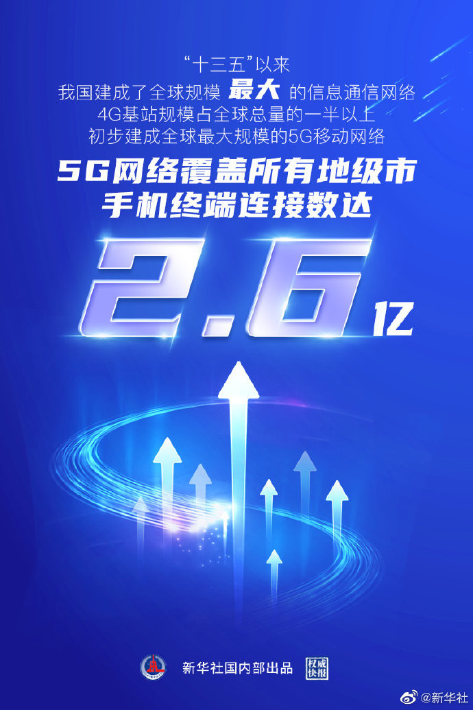 工信部副部长刘烈宏19日在国新办举行的国务院政策例行吹风会上说,我国建成全球规模最大的信息通信网络。目前,我国固定宽带和移动网络端到端用户体验速率较五年前增长约7倍。工信部提出,我国初步建成全球最大规模的5G移动网络,5G手机终端连接数达2.6亿。(海报设计:杨轶群)