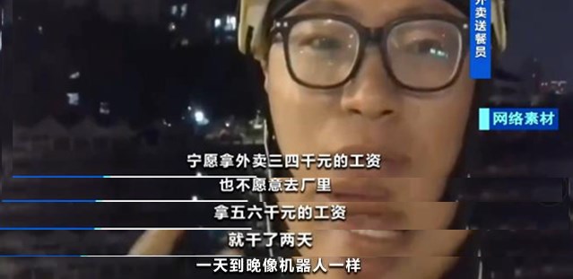 外卖送餐员:宁愿拿外卖三四千元的工资,也不愿意去厂里,拿五六千元的工资。我很早之前也去过一次厂里面,就干了两天,受不了了,一天到晚像机器人一样。