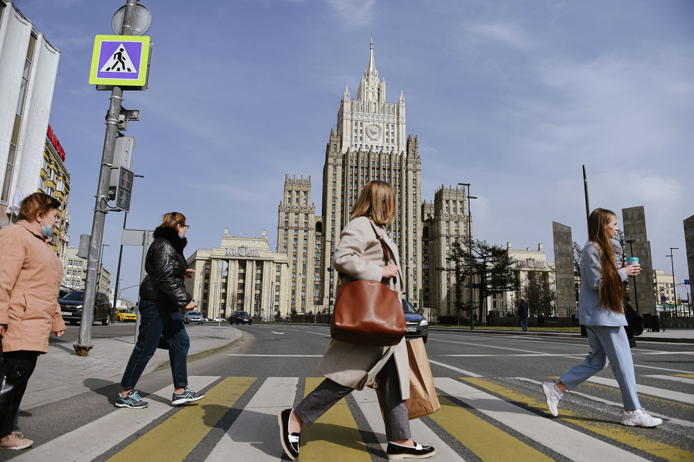 4月16日,在俄罗斯首都莫斯科,行人从俄罗斯外交部大楼附近走过。(新华社发,叶甫盖尼·西尼岑摄)