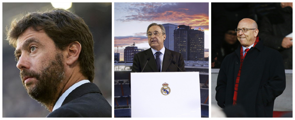 图为尤文图斯主席阿涅利(左)、皇马主席弗洛伦蒂诺(中)、曼联联席主席乔尔·格雷泽(右)。