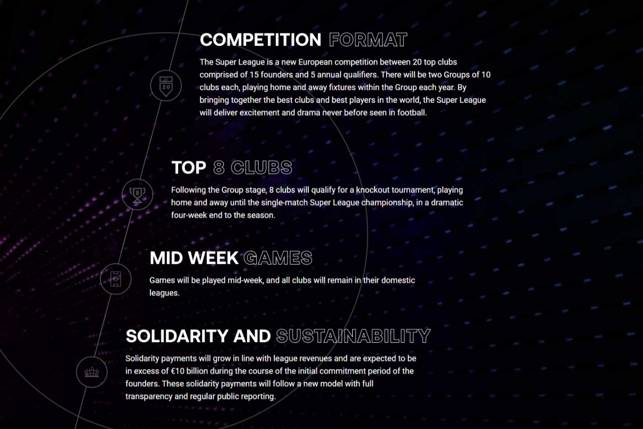 根据已公布的细节,欧洲超级联赛由来自意甲、西甲、英超三大联赛,包括尤文图斯、米兰双雄、皇家马德里、曼城在内的12支球队组成,另有几支球队表达了加盟的兴趣。现任皇马主席弗洛伦蒂诺将担任超级联赛第一届主席,尤文图斯主席阿涅利和曼联联席主席乔尔·格雷泽担任副主席。