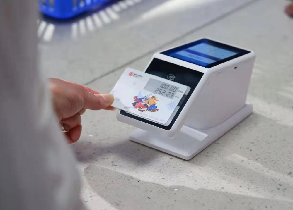 图为银行工作人员展示数字人民币卡式钱包使用方法。中国银行海南省分行供图