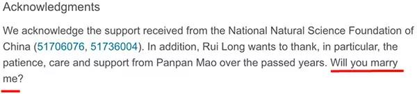 2018年华中科技大学的Rui Long在国际期刊的论文《Performance Analysis for Minimally Nonlinear Irreversible Refrigerators at Finite Cooling Power》论文致谢中向女友Panpan Mao求婚,传阅于相当多人的朋友圈,喂饱了大家狗粮。