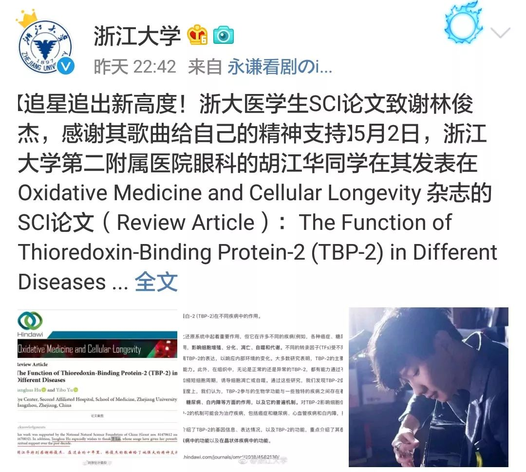 “作为一个勤勤恳恳的医学科研学生,只能通过人生的第一篇SCI论文致谢,来感谢偶像对自己的影响和鼓励”。