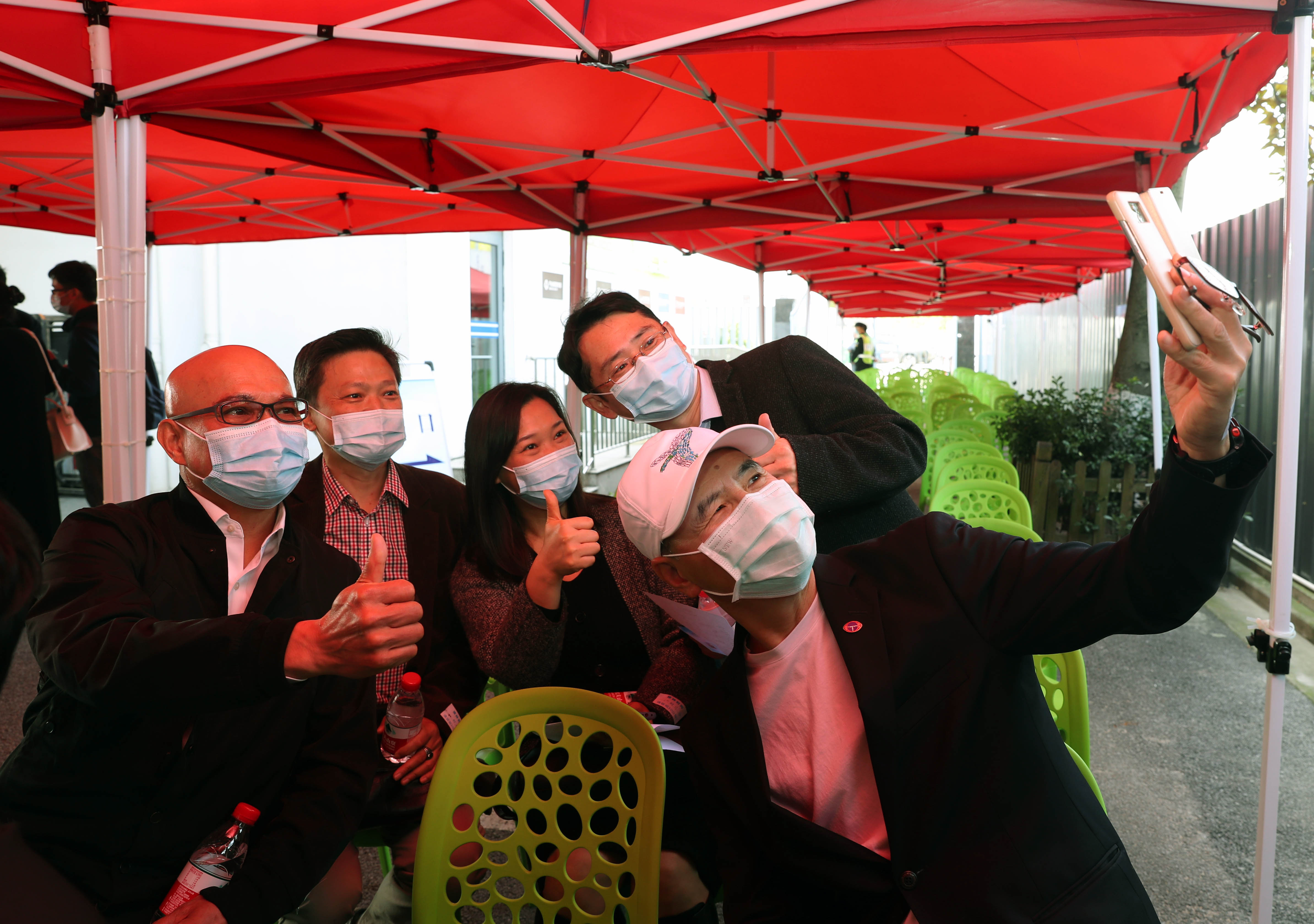 在嘉定新城马陆镇社区卫生服务中心,几名结伴而来的台胞在接种留观区自拍留念。新华社记者 刘颖 摄