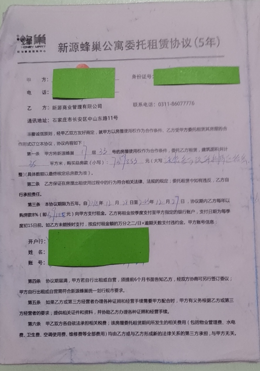 石家庄市新源蜂巢公寓委托租赁协议(5年)。(受访者供图)
