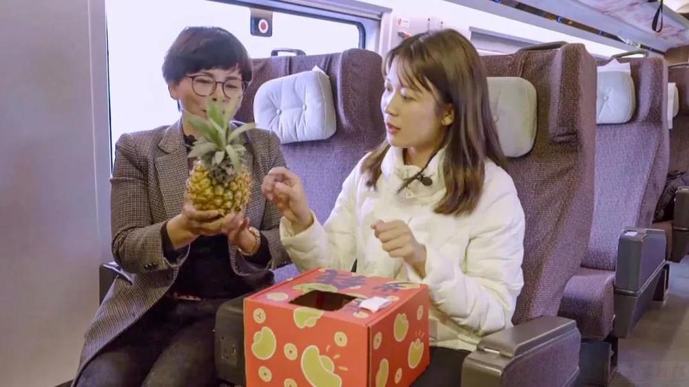 ↑“菠萝姐姐”吴建连(左)和“菠萝妹妹”王小颖(右)在徐闻菠萝高铁专列做推介。