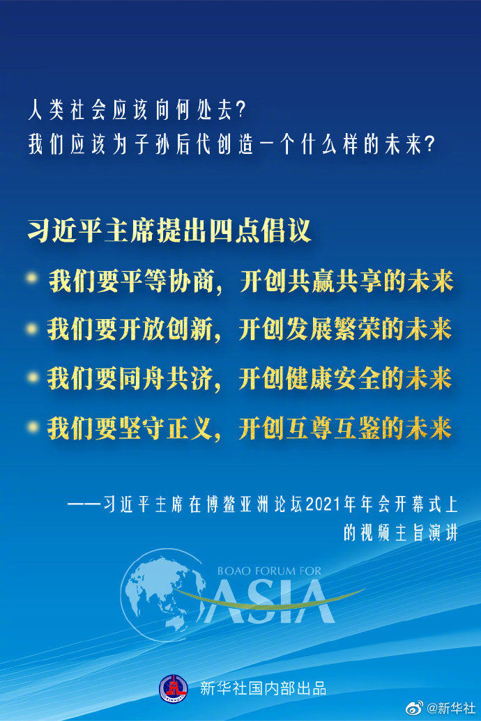【回应时代呼唤,习近平主席提出四点倡议】博鳌亚洲论坛2021年年会开幕式20日上午在海南博鳌举行,国家主席习近平以视频方式发表主旨演讲。面对“人类社会应该向何处去?我们应该为子孙后代创造一个什么样的未来?”这一重大命题,习近平主席提出四点倡议。
