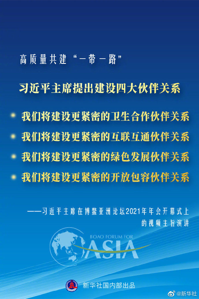 【高质量共建“一带一路”,习近平主席提出建设四大伙伴关系】博鳌亚洲论坛2021年年会开幕式20日上午在海南博鳌举行,国家主席习近平以视频方式发表主旨演讲。针对高质量共建“一带一路”,习近平主席提出建设四大伙伴关系。