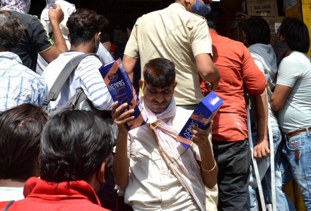 4月19日,印度新德里居民在全城实施封锁前抢购酒品。由于疫情不断恶化, 印度首都新德里首席部长凯杰里瓦尔19日宣布,自当晚22时起至26日凌晨5时全城实施封锁。(新华社发,帕塔·萨卡尔摄)