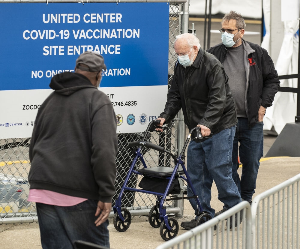 3月10日,在美国芝加哥,一位老人进入联合中心球场新冠疫苗接种点。(新华社发,乔尔·莱纳摄)