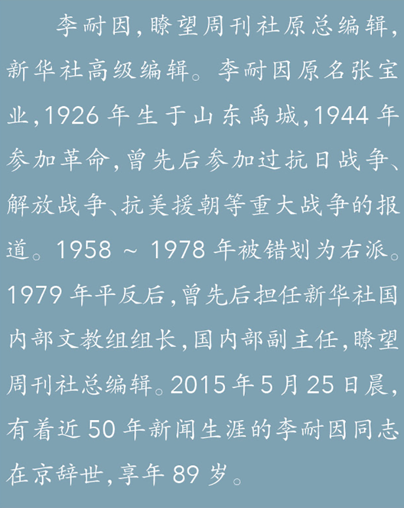 耐因当领导非常大度,他是个有心胸的人。那时的瞭望,人才荟萃,聚集了一大批社里有名的大写手、大编辑,难免互不服气。李耐因上任后,我发现扯闲篇的少多了,甭管多牛的大腕,没有一个说他不好的。瞭望这个大舞台,让他给镇住了。现在想想能镇住这个台的不只是本事,还有人品。