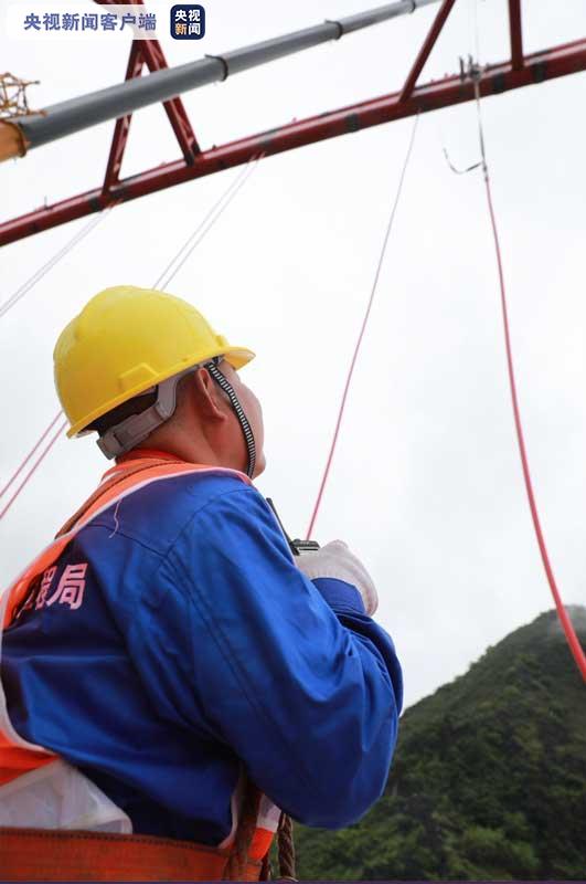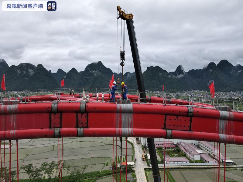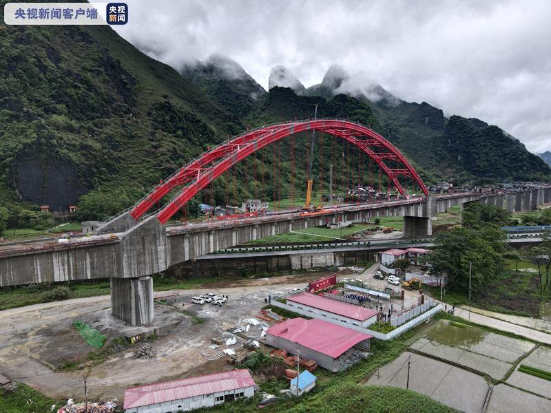 4月19日,经过施工人员2个多小时的奋战,贵南高铁澄江双线特大桥180米拱加劲连续梁钢管拱最后一组吊杆完成了安装和张拉,标志着贵南高铁全线最大跨度的连续梁提前2个月顺利竣工,为6月份全桥竣工奠定了坚实的基础。
