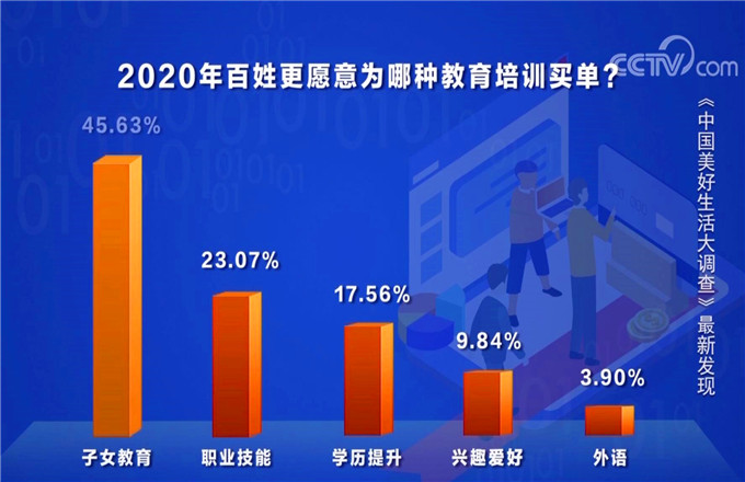 2021年,有31.3%的中国人想在教育培训上增加消费,那么他们更愿意为哪种教育培训买单呢?大调查数据显示,排在第一位的就是“孩子教育”,占比45.63%,超过第二名“职业技能类培训”近一倍。