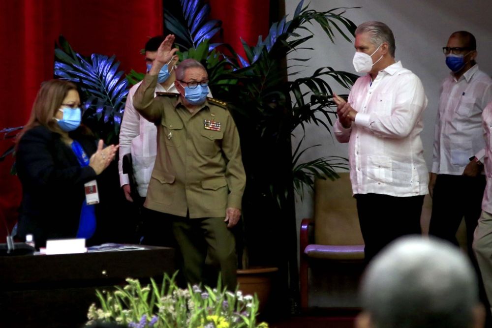4月16日,古巴共产党中央委员会第一书记劳尔·卡斯特罗(前左二)与古巴国家主席迪亚斯-卡内尔(右二)在哈瓦那出席古巴共产党第八次全国代表大会。(新华社/拉美社)