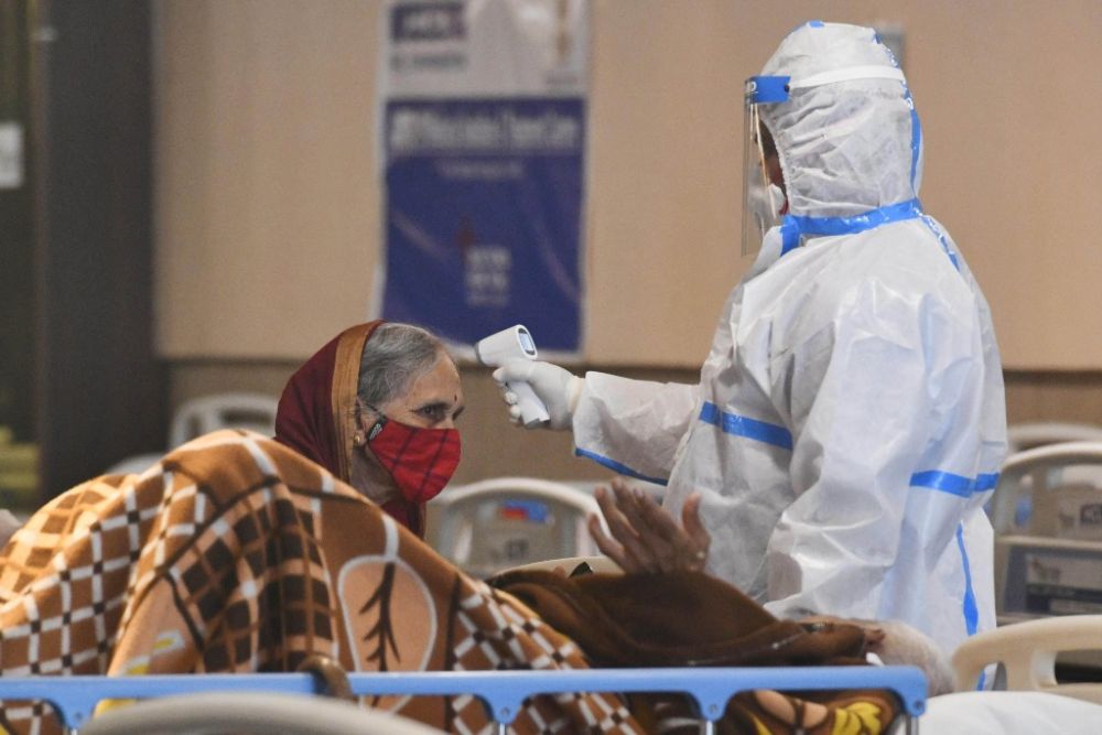 4月13日,医务人员身着防护服在印度首都新德里一家医院的隔离区照看新冠病人。(新华社发,帕塔·萨卡尔摄)