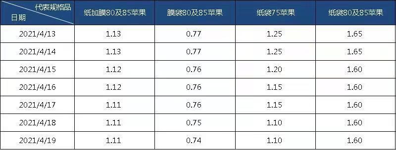 表1 运城产区各规格品均价(4月13日-4月19日)