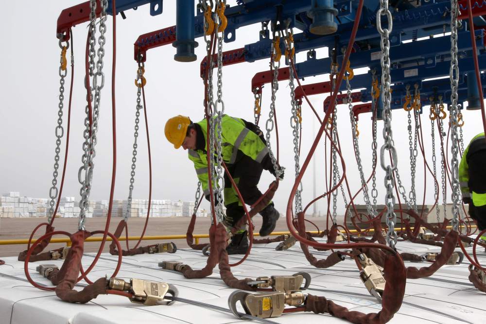 这是2017年4月28日在芬兰科特卡港拍摄的中远海运集团天字号多用途货轮之一“天乐”号杂货船在码头装货。(新华社记者李骥志摄)