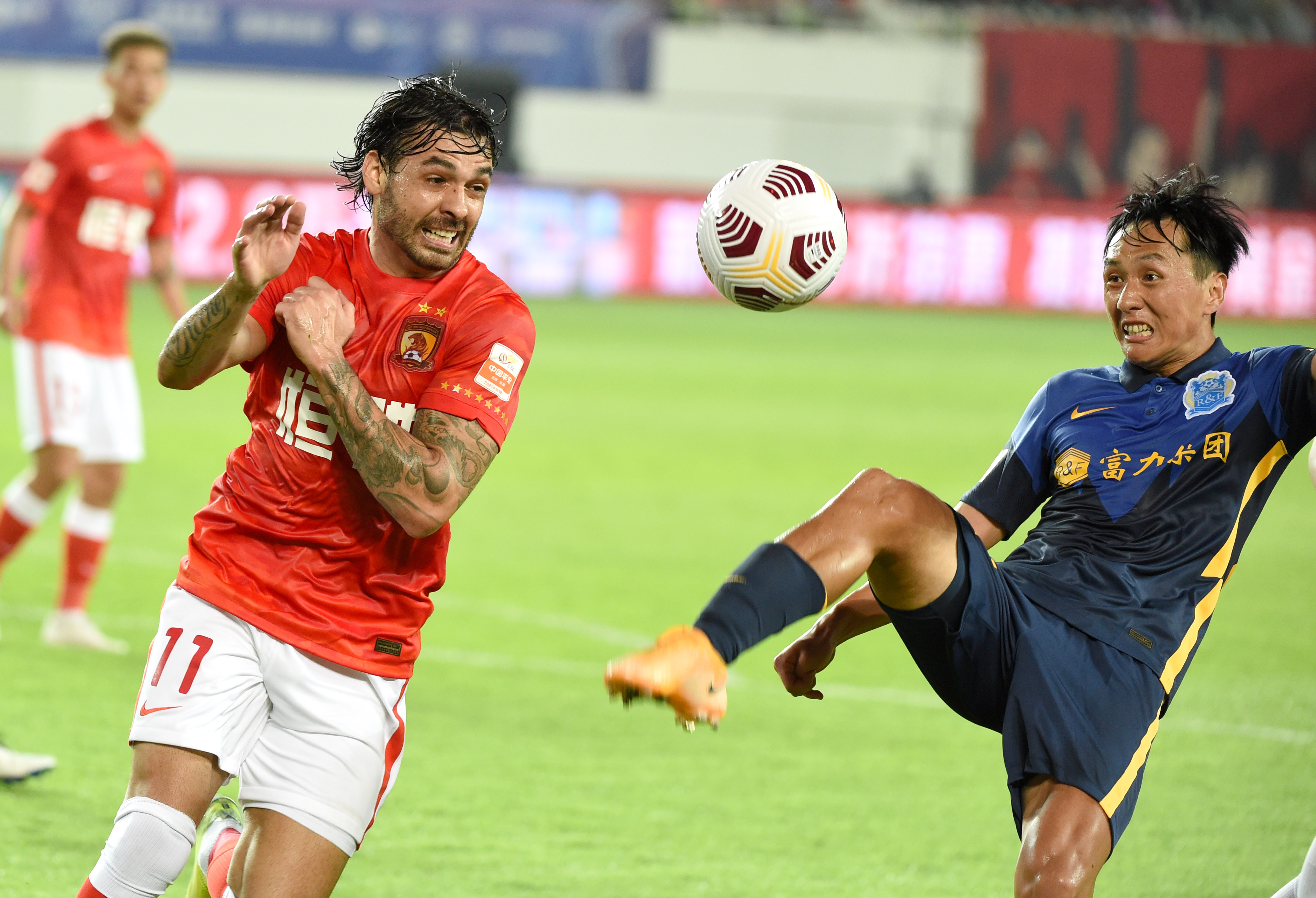 4月20日,广州队球员艾克森(前)在比赛中主罚点球。新华社记者邓华摄