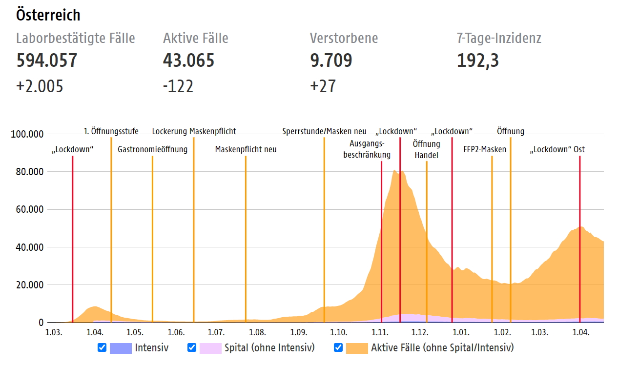 根据奥地利卫生部20日公布的数据,奥地利累计确诊新冠肺炎病例594057例,新增2005例,累计死亡9709例,新增27例,现存病例43065例,已有541283例康复病例。目前有1554例病例接受住院治疗,还有568例在重症监护病房。