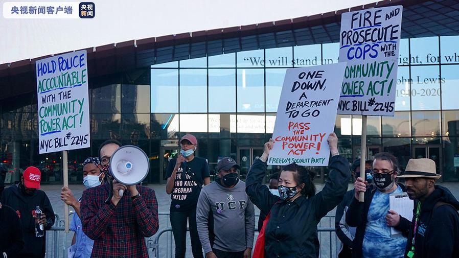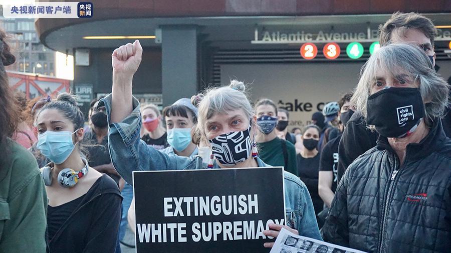 现场民众手举弗洛伊德画像、“改革警察”“杜绝白人至上”等标牌,不时高喊“没有正义就没有和平”等口号。