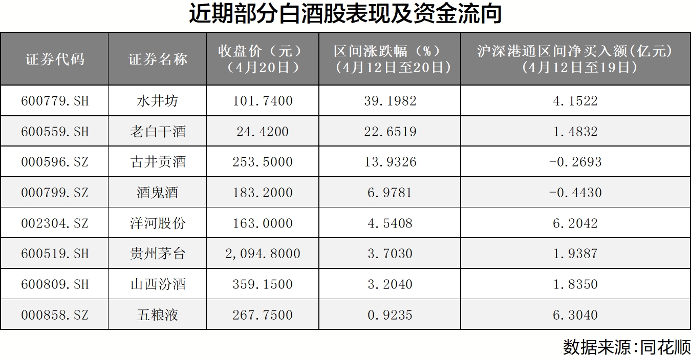 截至当日收盘,皇台酒业涨停,收报20.21元;金徽酒、迎驾贡酒一度涨停,分别收涨6.99%和5.91%;酒鬼酒午后拉升一度冲高至192元,最终报收于183.2元;青青稞酒、山西汾酒、口子窖等也纷纷走高。水井坊近日预告今年一季度实现营收同比增长约为70.2%,净利润同比增长120%。利好消息刺激下,公司股价自业绩预告至今涨幅已超40%。不过,相比二三线白酒,一线白酒龙头企业反弹势头并不显著,贵州茅台当日股价一度站上2100元,收涨0.33%;五粮液收报267.75元,收涨0.78%。