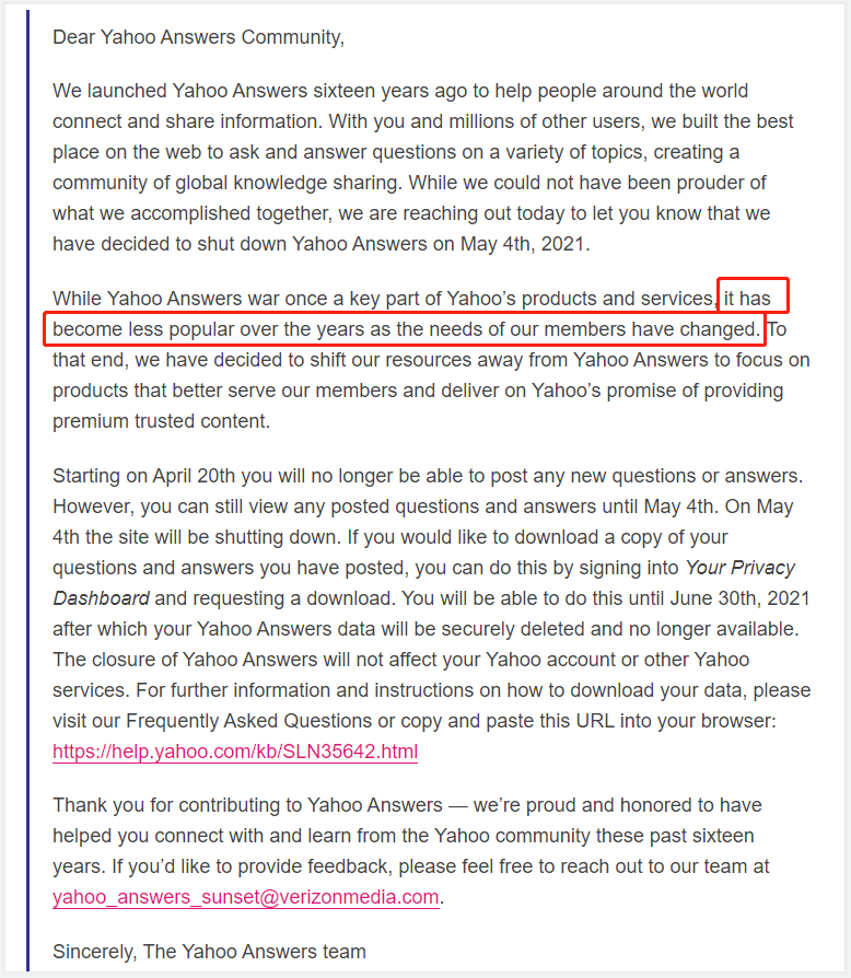 根据雅虎问答官方发给雅虎用户的一封信中显示,之所以关停网站是因为“随着用户需求的变化,它(雅虎问答)已经变得不那么受欢迎了”。