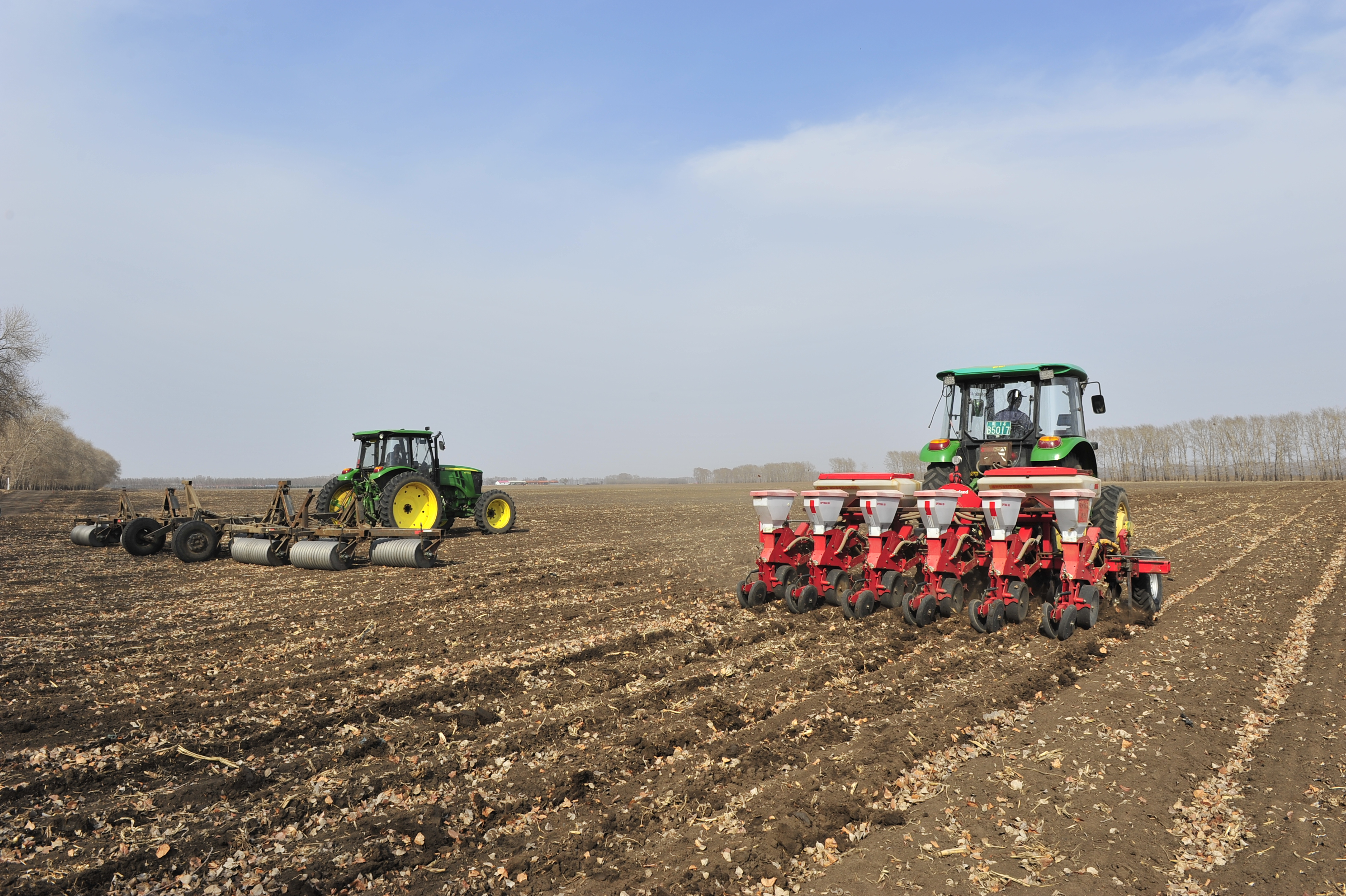 近日,在黑龙江北大荒农业股份有限公司友谊分公司第五管理区,一台精密播种机正在播种玉米,同时进行镇压作业,确保一次性播种保全苗。今年,友谊分公司玉米播种面积将达68万亩。