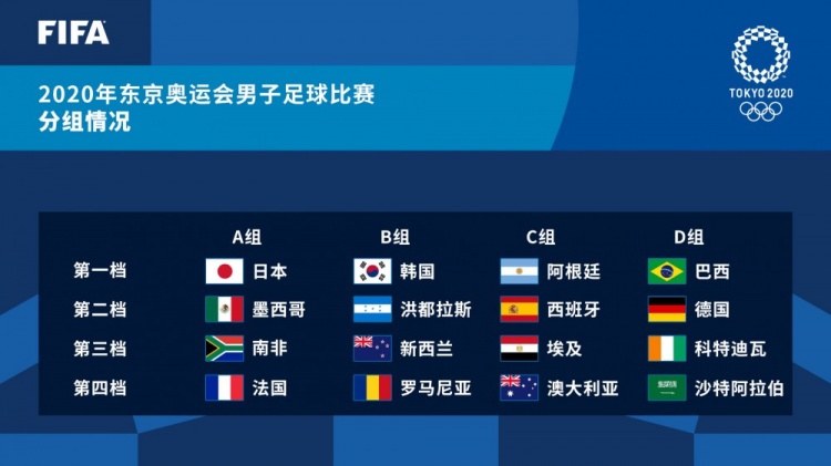东京奥运会男足项目抽签仪式也于同一天进行。抽签规则与女足相同,共16支球队将争夺奥运会金牌。男足比赛将于7月22日-8月7日进行。