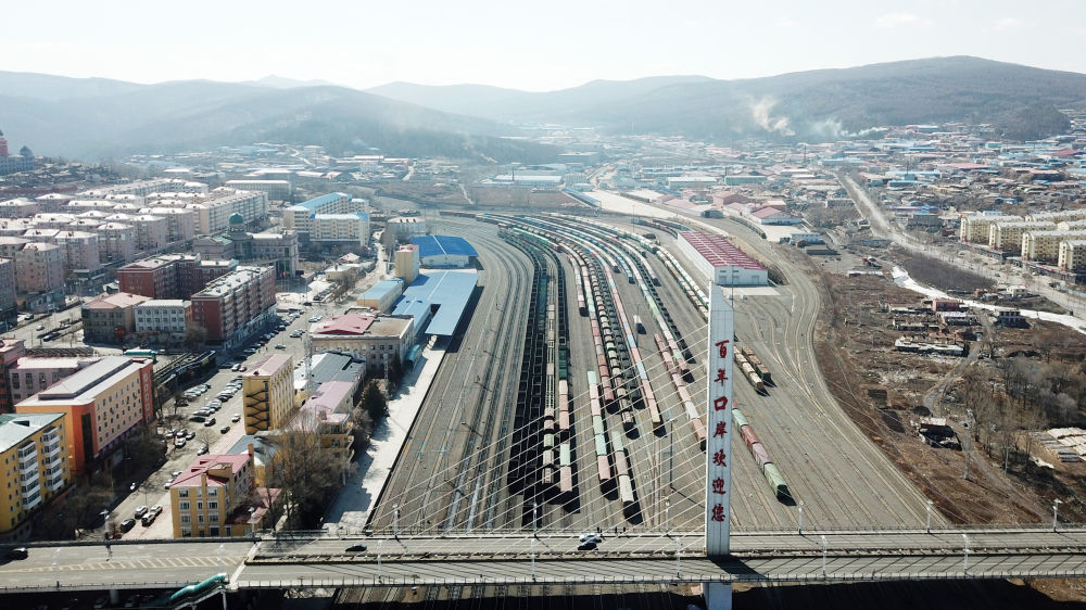 3月31日拍摄的绥芬河站南场,中欧班列从这里出入境(无人机照片)。(新华社记者王建威摄)