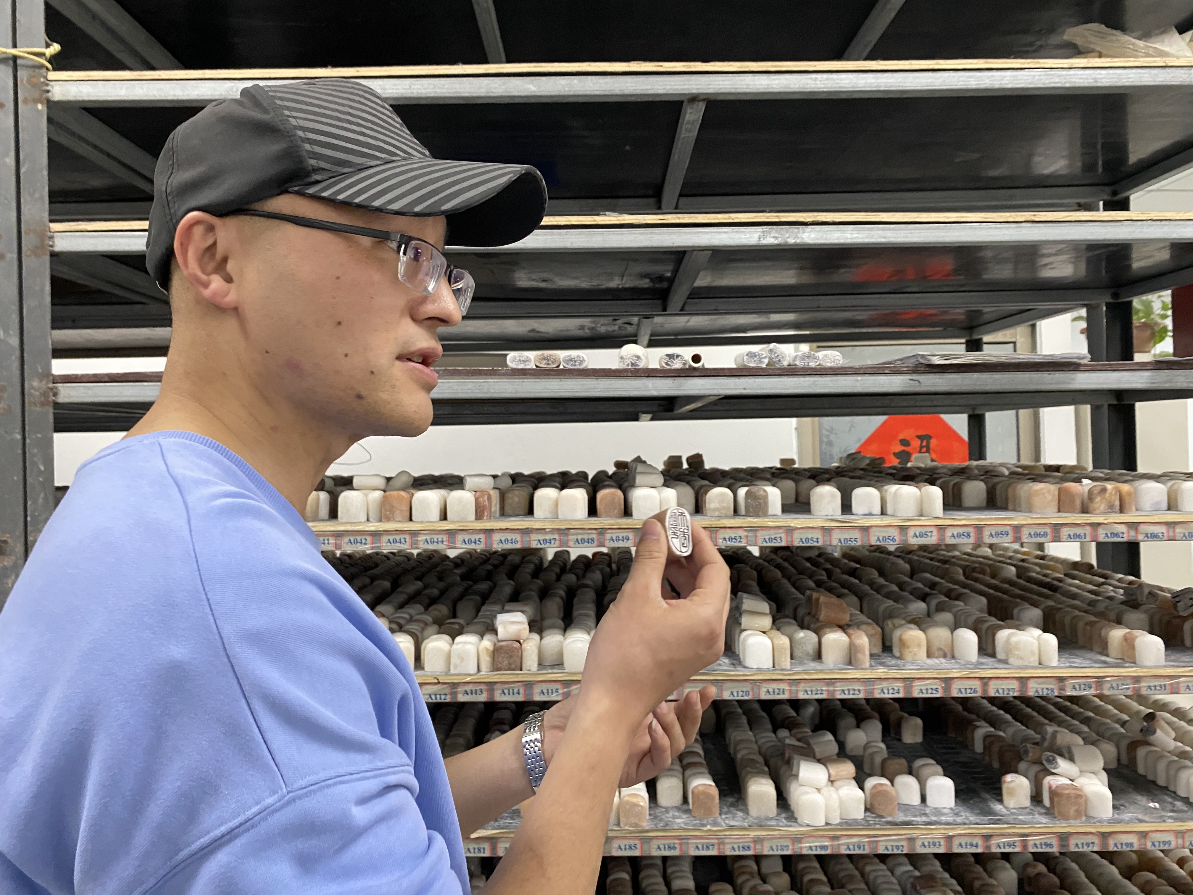 刘鹏正介绍孔府印阁印章,身后是一排排待发货的印章。新华社记者张昕怡 摄