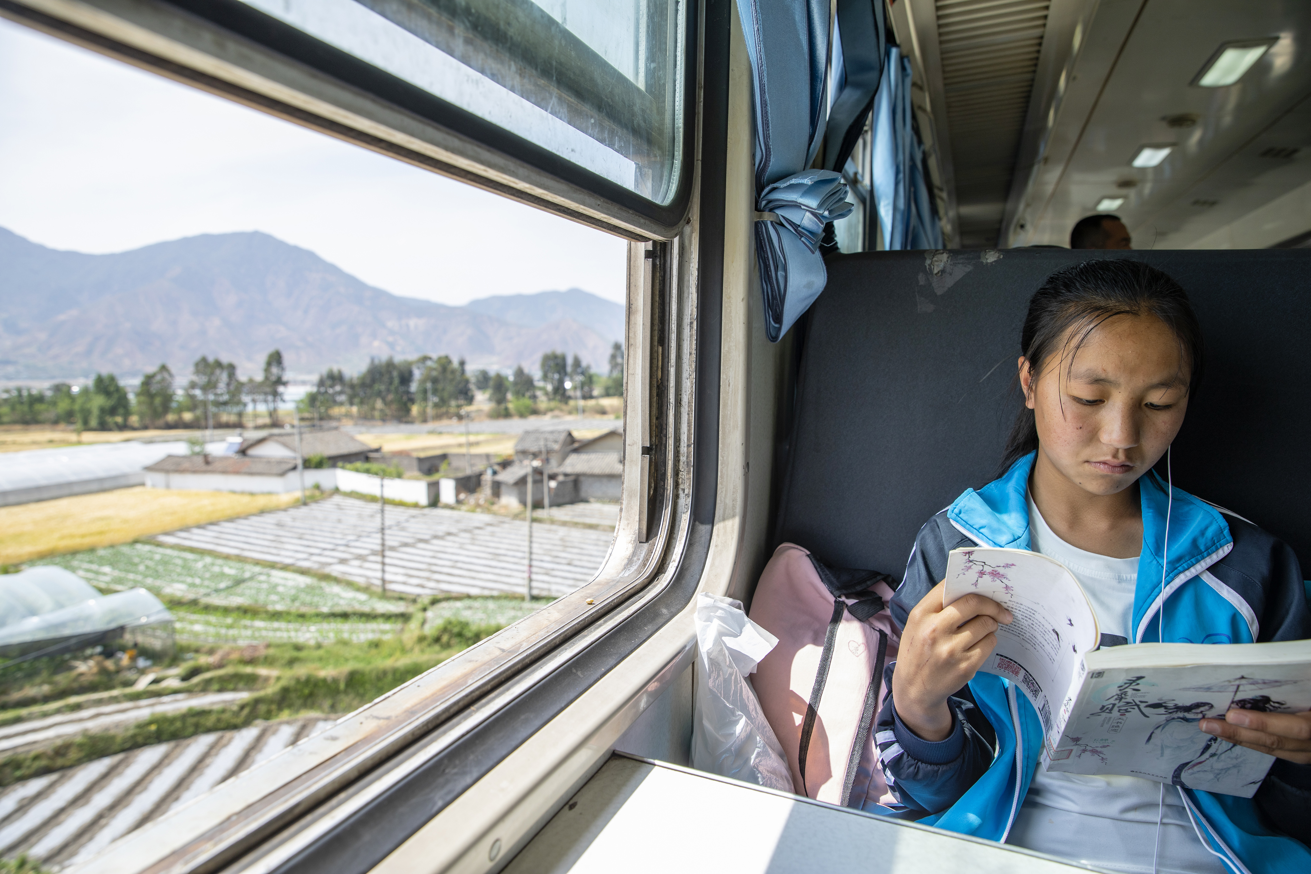 4月15日,一名喜德县瓦尔学校的学生乘坐5634次列车回家。新华社记者 沈伯韩摄