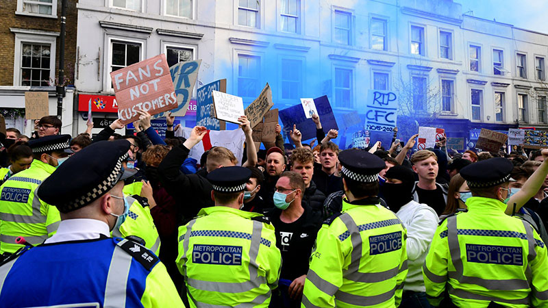 4月18日,欧洲12支足球俱乐部,皇马、巴萨、马竞、AC米兰、国际米兰、尤文图斯、曼联、曼城、阿森纳、利物浦、切尔西、热刺宣布达成协议、创立欧洲超级联赛。消息公布后,因超级联赛不顾球迷利益、违反公平竞争原则,受到包括英国首相约翰逊在内的高级别官员、英格兰足球总会主席威廉王子以及大批球迷的强烈反对。(总台记者 田晓春)