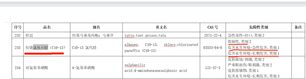 原国家安全监管总局等10个部门公布的《危险化学品目录》列入了短链氯化石蜡,其危险性类别定为“致癌性类别2,危害水生环境-急性危害类别1,危害水生环境-长期危害类别1”,表明这是一种被怀疑导致癌症,并对水生生物毒性大,且具有长期持续影响的物质。