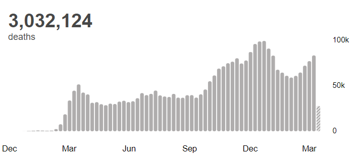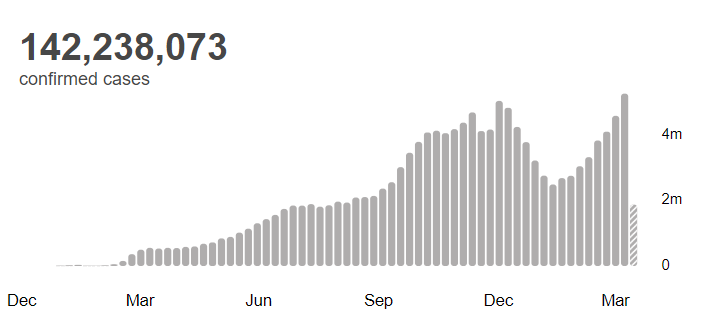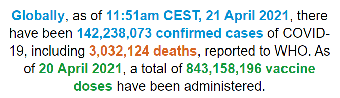 根据世卫组织最新实时统计数据,截至欧洲中部夏令时间4月21日11时51分(北京时间4月21日17时51分),全球累计新冠肺炎确诊病例142238073例,累计死亡病例3032124例。