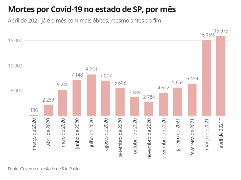 截至当地时间4月21日,巴西新冠肺炎确诊人数最多的圣保罗州,4月初至今因疫情死亡人数达到疫情以来单月死亡人数的峰值。4月份前21天,总计15975人死于新冠肺炎,超过了3月份的15159人。