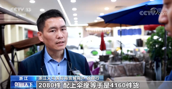 浙江义乌国际商贸城商户 徐照行:一个客人一单就定了一款遮阳伞,2080件,配上伞座等于是4160件货。我们估计是国外的疫情,让国外的人是宅在家里的,那他就需要户外的家具来打理庭院,比方说秋千、户外桌椅之类的,放在庭院里面,自己可以用。”