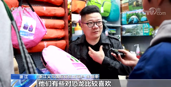 浙江义乌国际商贸城商户 朱悦来:我们专门针对他们,在产品外面设计了很多图腾设计,他们有些对恐龙比较喜欢,对于一个家庭来讲,他们不止买一顶两顶,他们可以买一系列在家里可以玩的帐篷。