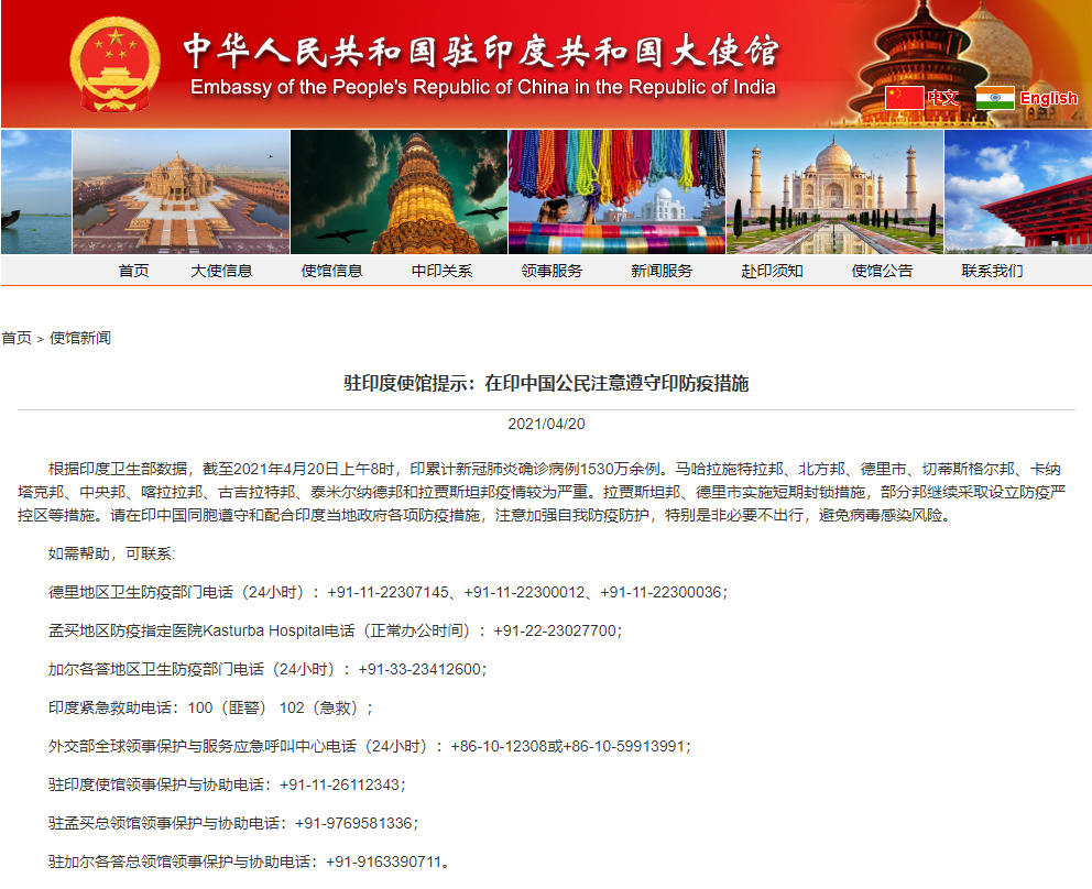 中国驻印度使馆20日在其官网发布公告,提示在印度中国公民注意遵守印度防疫措施。公告说,当前,印度马哈拉施特拉邦、新德里市等地疫情较为严重。其中,拉贾斯坦邦、新德里市实施短期封锁措施,部分邦继续采取设立防疫严控区等措施。