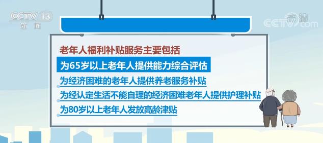 在老年人照顾方面,标准规定的老年人福利补贴服务主要包括,为65岁以上老年人提供能力综合评估;为经济困难的老年人提供养老服务补贴;为经认定生活不能自理的经济困难老年人提供护理补贴;为80岁以上老年人发放高龄津贴。