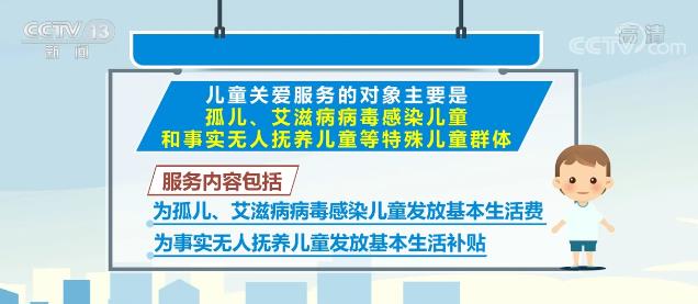 据介绍,儿童关爱服务的对象主要是孤儿、艾滋病病毒感染儿童和事实无人抚养儿童等特殊儿童群体。服务内容包括为孤儿、艾滋病病毒感染儿童发放基本生活费,为事实无人抚养儿童发放基本生活补贴。