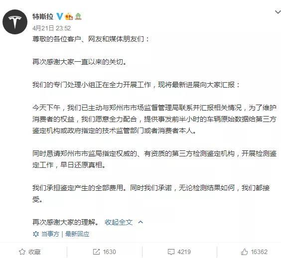 4月21日深夜,特斯拉官方微博发文称:“为了维护消费者的权益,我们愿意全力配合,提供事发前半小时的车辆原始数据给第三方鉴定机构或政府指定的技术监管部门或者消费者本人。”