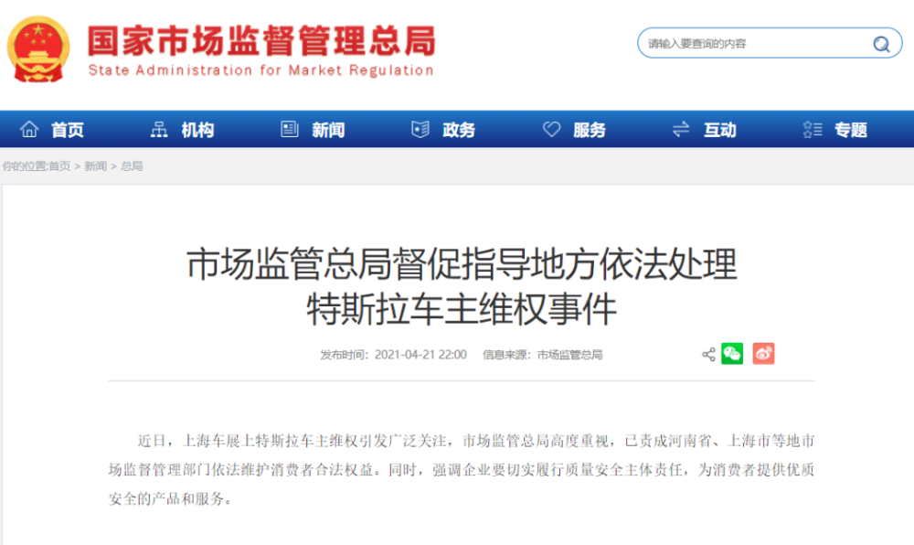 市场监管总局表示,近日,上海车展上特斯拉车主维权引发广泛关注,市场监管总局高度重视,已责成河南省、上海市等地市场监督管理部门依法维护消费者合法权益。企业要切实履行质量安全主体责任,为消费者提供优质安全的产品和服务。