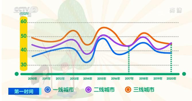 但三线城市居民的幸福感,除了2017年和2020年略低于二线城市外,其他时间一直明显高于一二线城市的居民。生活在小城市的居民普遍烦心事更少,生活得更惬意。