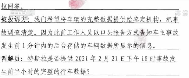 在随后的调解中,投诉人张女士认为,被投诉人特斯拉公司有义务并要求特斯拉公司提供事故发生前半小时完整的行车数据。被投诉人特斯拉公司同意将相关行车数据完整提供给投诉人,但提出三个前提条件:一是需签订协议,约定数据用途;二是投诉人把车辆移到钣喷中心车间;三是共同委托第三方检测公司,检测刹车系统是否存在质量问题。对此,投诉人张女士则要求被投诉人先提供数据再讨论鉴定事宜。截至目前,双方就投诉事宜未达成一致意见。