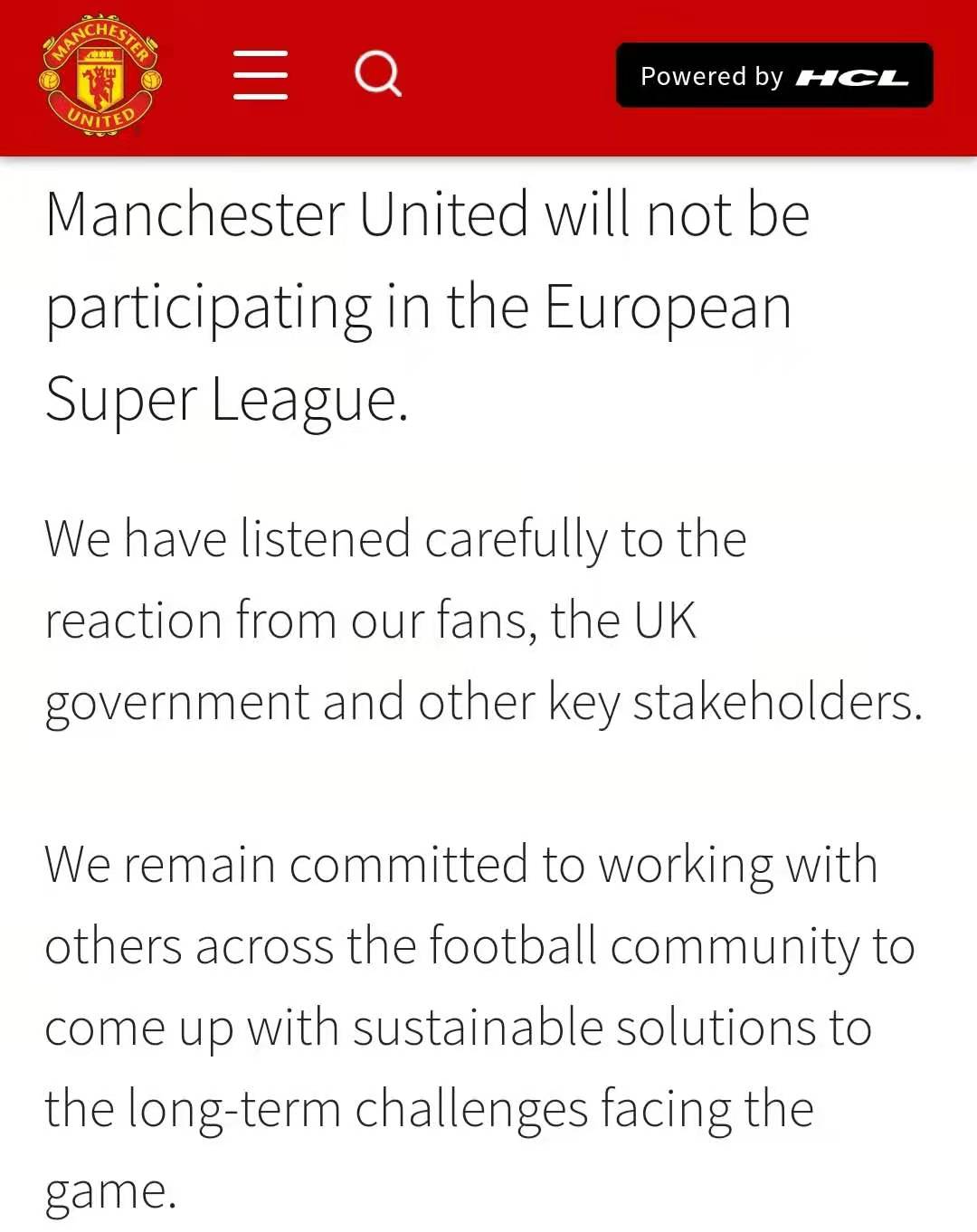 曼联宣布退出欧洲超级联赛的声明。图片来自曼联官网