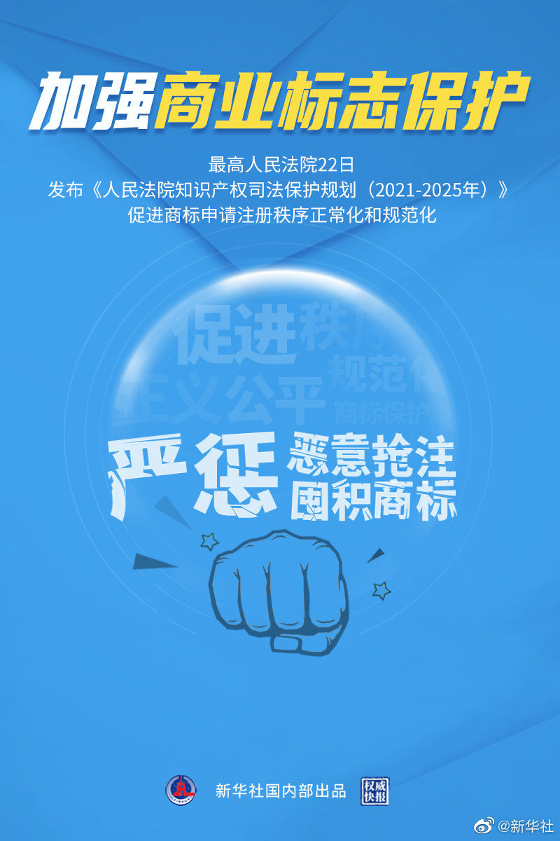 【权威快报丨人民法院加强恶意抢注囤积商标等行为惩治】一段时间以来,突然爆红的网络名人,广为流传的网络热词,被商标抢注者集中“哄抢”。抢注爆款商标成为风潮,商家利用热词吸引一时热度。恶意抢注、囤积商标,严重违背诚实信用原则,扰乱的是市场秩序,破坏的是公平正义。最高人民法院22日发布《人民法院知识产权司法保护规划(2021-2025年)》,明确了“十四五”时期知识产权司法保护的重点工作举措。提出加强商业标志保护。加大对恶意抢注、囤积商标等行为惩治力度,促进商标申请注册秩序正常化和规范化。(记者:刘奕湛 海报设计:杨轶群)